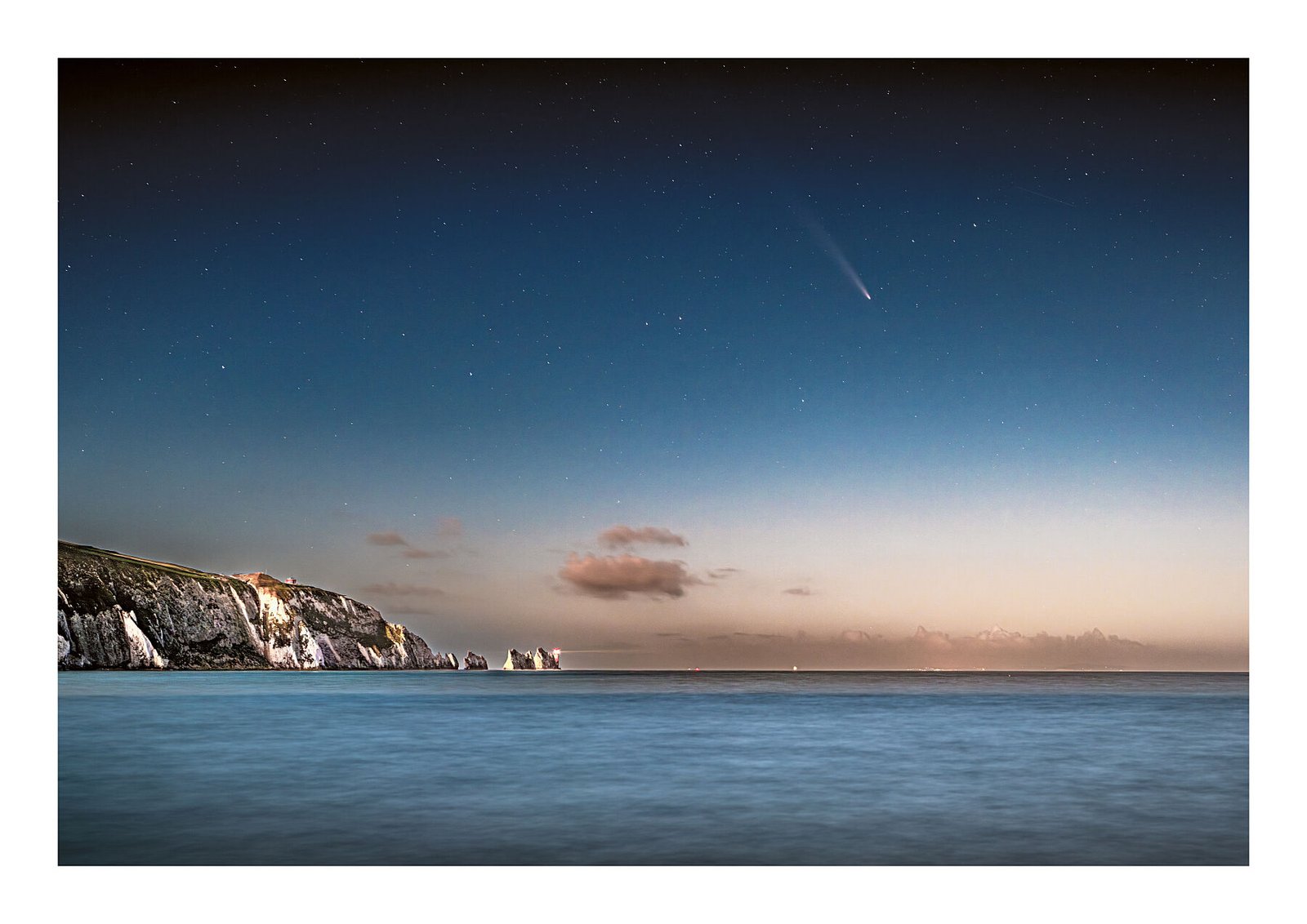 This fine art nightscape captures a unique celestial alignment—The Needles bathed in soft starlight, the comet slicing through space like a fleeting visitor. With the Isle of Wight’s designation as a Dark Sky area, moments like this are rare, magical, and deeply humbling.