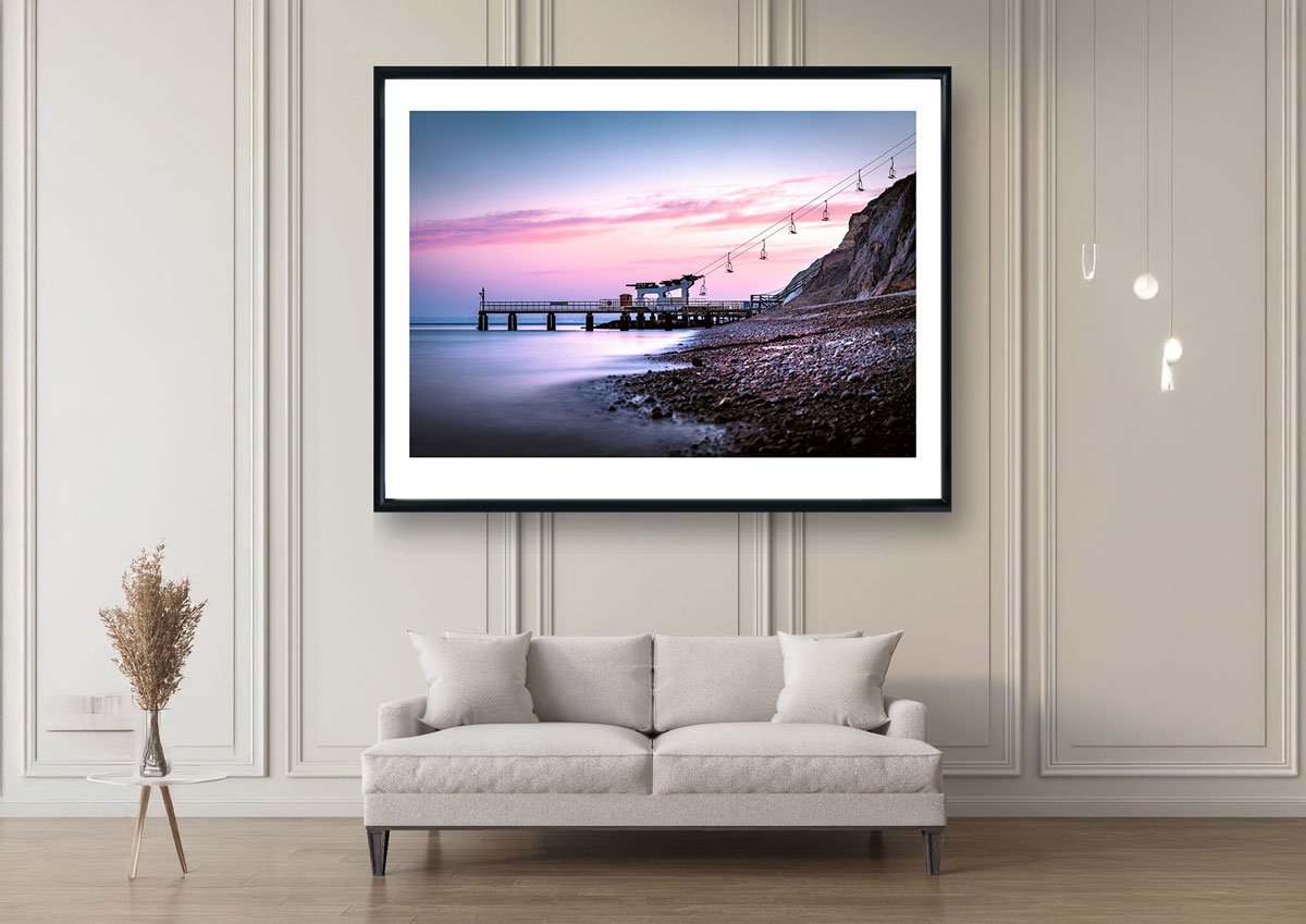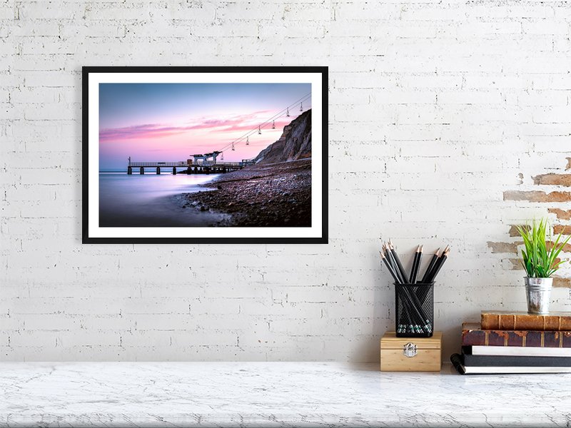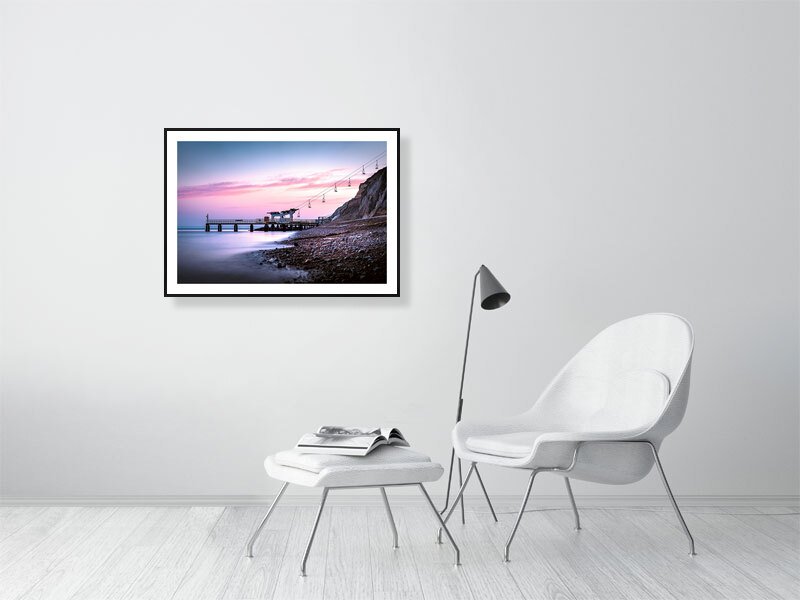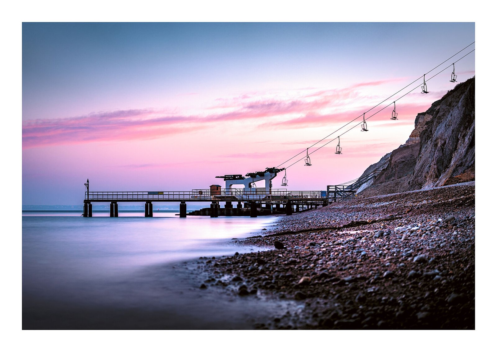 This peaceful fine art photograph of Alum Bay on the Isle of Wight was captured just as the first light of day began to rise. Using a long exposure, I softened the surface of the sea into a glassy calm, letting the moment stretch and breathe. In the distance, the silhouette of the cable car and its delicate lines lead the eye from the shore to the cliff top—quiet, still, and full of promise.