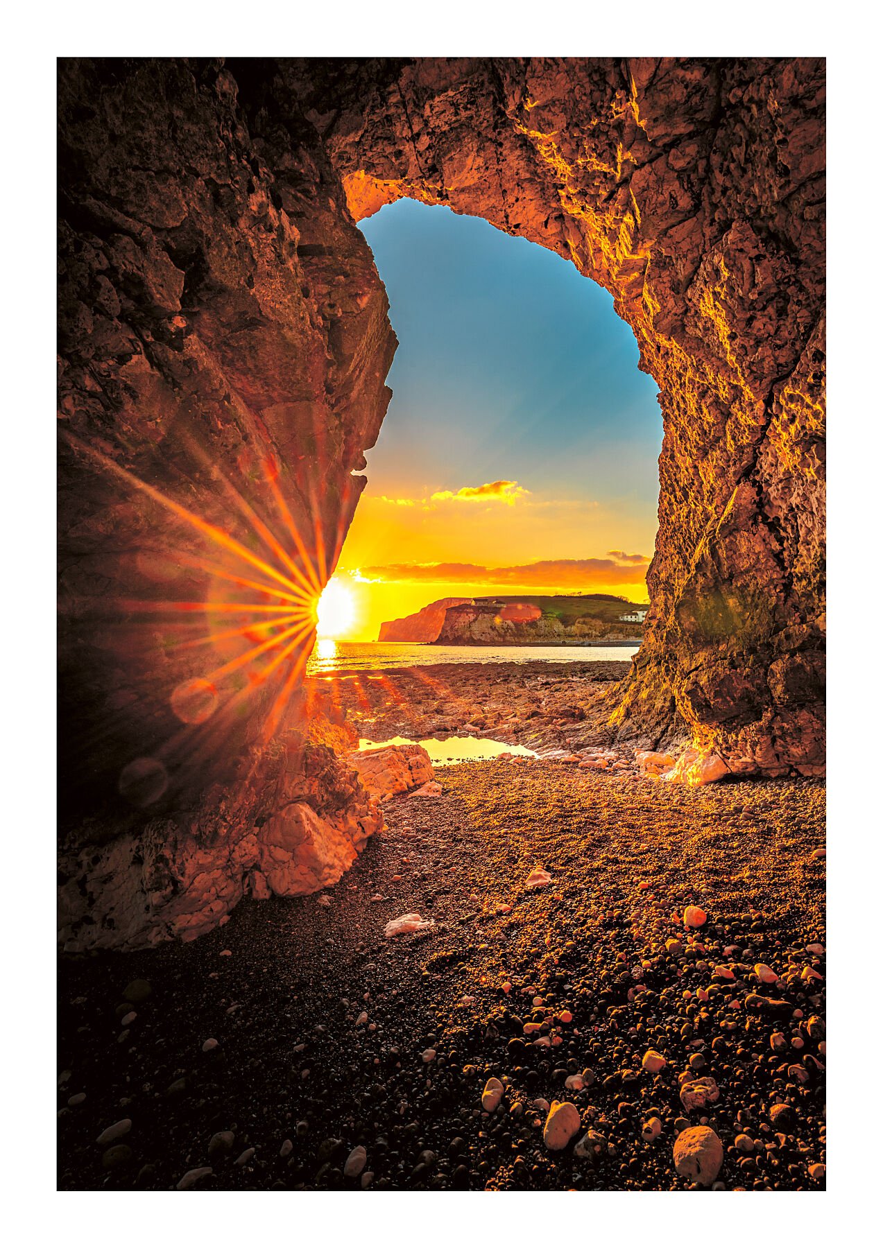 This photograph was taken from deep inside one of the caves at Freshwater Bay on the Isle of Wight—an incredible spot that feels like a secret window to the sea. As the sun dipped low over the water, its golden light burst through the cave entrance, casting a warm glow on the walls and shimmering across the waves beyond.