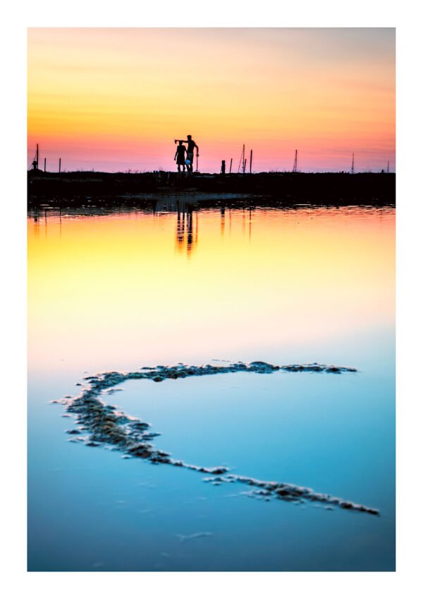In this captivating print, you’ll see two figures silhouetted against the magnificent blaze of the setting sun. The sky is awash with warm, vibrant hues, transforming the horizon into a masterpiece of colour. What makes this image so special to me is the way the calm water in the foreground acts as a perfect mirror, reflecting not only the stunning golden sky above but also the elegant, elongated forms of the two figures. It creates a beautiful sense of depth and connection, a quiet intimacy against the vastness of the evening.