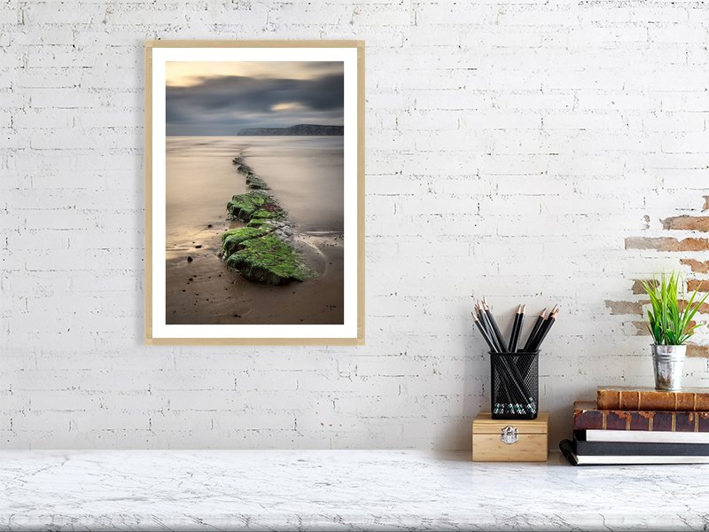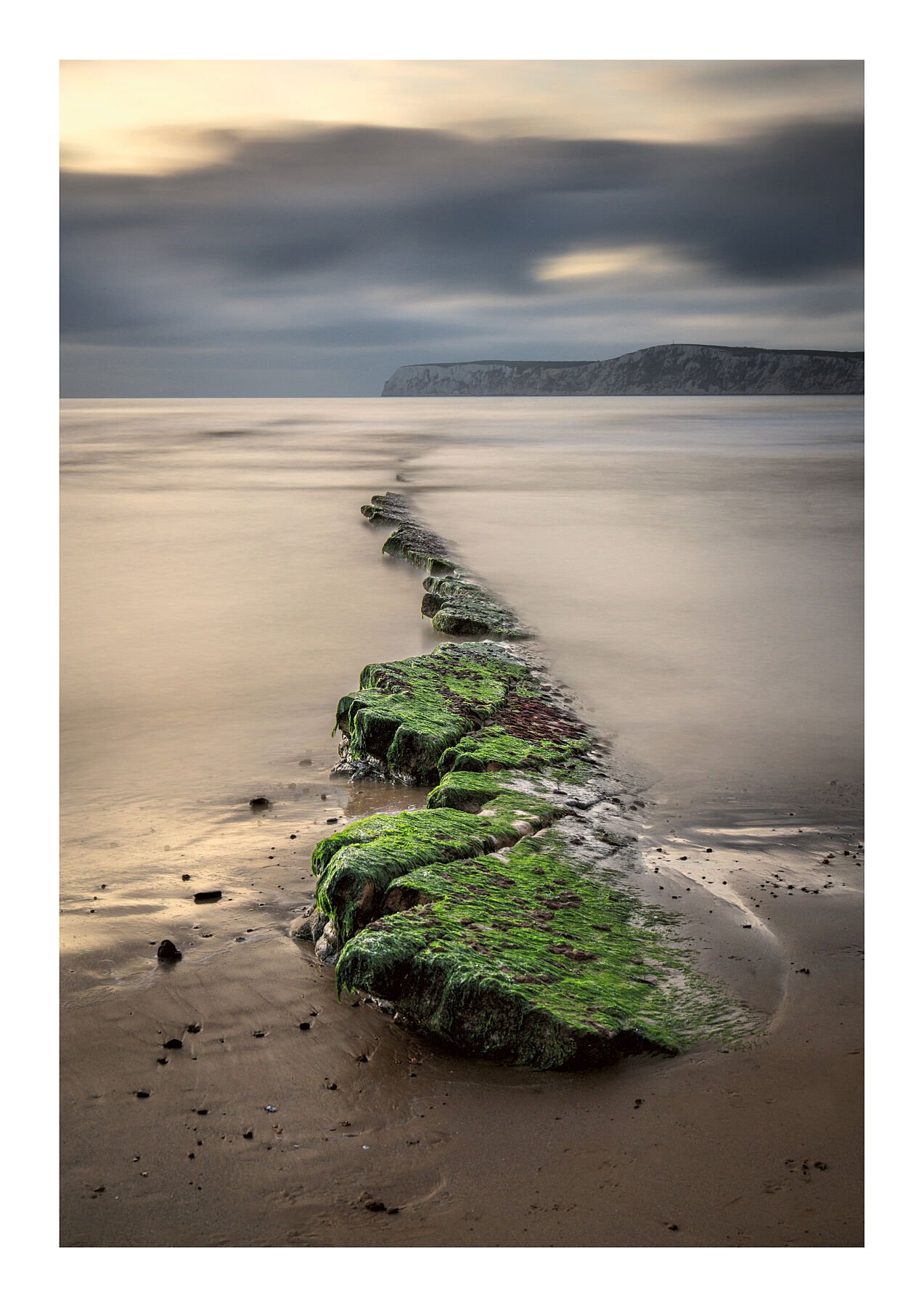 A meditative moment along the Isle of Wight’s untamed coastline. Captured at Compton Bay, this long-exposure photograph reveals the rock shelf stretching quietly into the sea, while the distant outline of Tennyson Down rises softly on the horizon. The movement of water is smoothed into a gentle veil, allowing land and sea to settle into a calm, balanced harmony. The result is an image defined by stillness, depth, and a sense of timeless coastal rhythm.